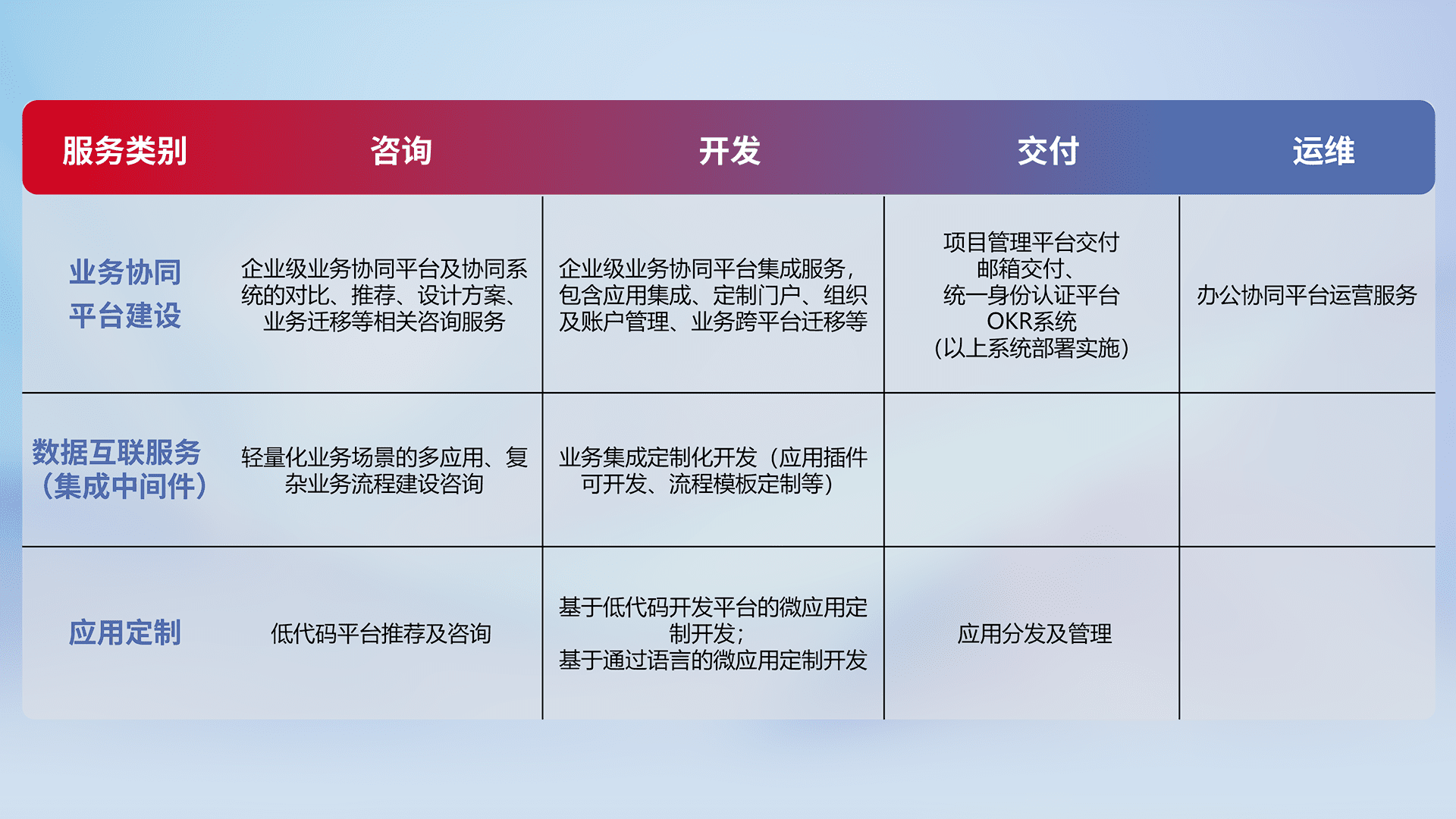 针对钉钉、、、企微、、、、IDaas等平台级产品提供产品的规划、、、方案、、、交付、、、定制化开发等服务,,实现如统一协同办公、、、、智能客户服务、、、混合会议管理、、、智能数据查询、、、、等业务场景,,,,实现数字化转型。。。