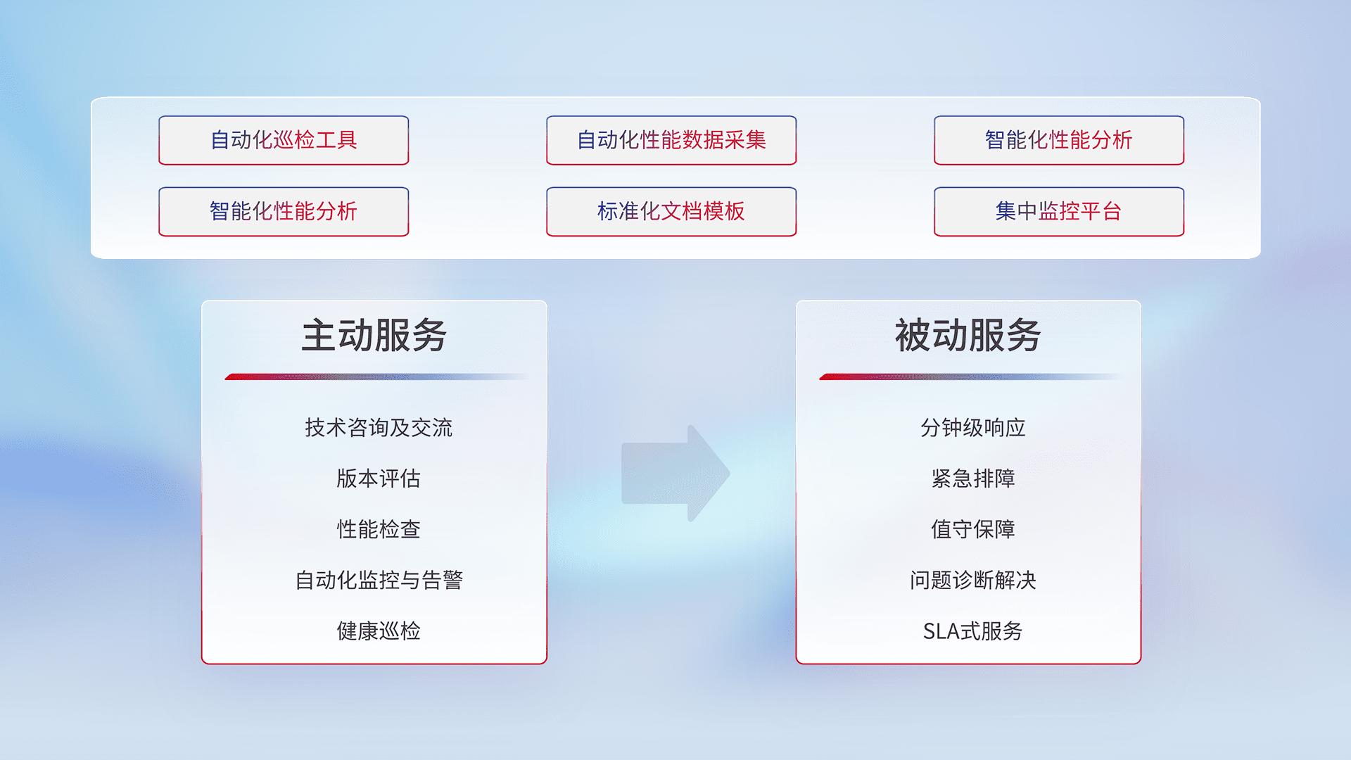 智能化工具和标准化文档,,,,保障服务质量,,,,提供主动服务(包含技术咨询、、、版本评估、、、性能检查、、、、自动化监控与告警、、、、健康巡检)和被动服务包含(分钟级响应、、、、紧急排障、、、值守保障、、问题诊断解决、、、、SLA服务)。。